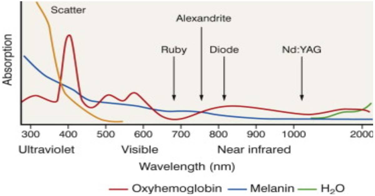由於我們的目標是針對真皮層毛囊的黑色素(Melanin)做治療,按照上圖的雷射吸收光譜可以得知波長越短黑色素吸收的能量越多,那為何不選擇極短波長的雷射來做治療呢?