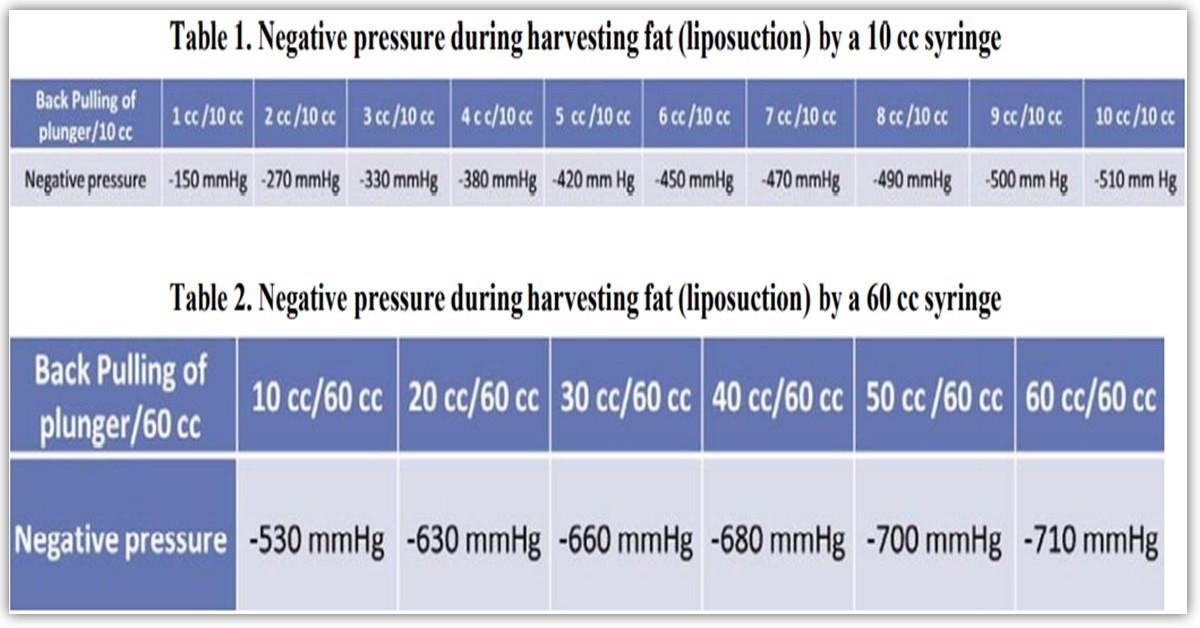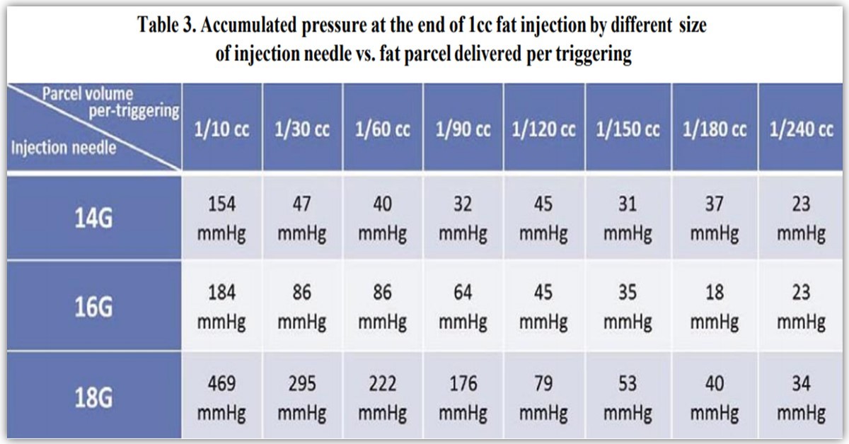 這是一個很有趣也很有意義的研究,一般以 10cc 的空針來說,回抽到 2cc 至 3cc 就會產生 -270 mmHg ~ -330 mmHg 的壓力,若回抽過多反而造成太大的負壓就有可能破壞脂肪細胞。而用 60cc 的空針抽取脂肪時,很容易就造成負壓過大。