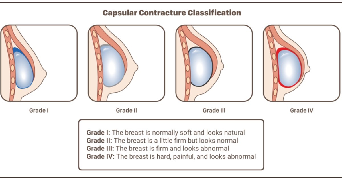 然而,當這層莢膜發生收縮,壓迫到乳房植入物時,就可能導致所謂的莢膜攣縮。這可能會引起一些疼痛和不適,甚至讓乳房植入物變形,影響到乳房的外觀。莢膜攣縮一般可以分為四個程度,從只能感覺到植入物但乳房外觀正常,到乳房硬化、變形並伴有疼痛等症狀。