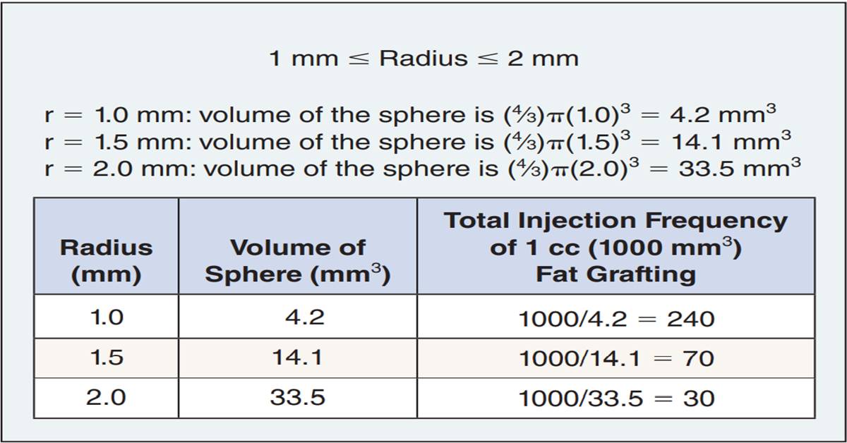 當脂肪顆粒的半徑為 1.0mm 時,則脂肪顆粒的體積為 4.2mm3,當我們使用 1cc 的脂肪槍施打時,可以產生 240 顆半徑為 1.0mm 的脂肪顆粒。若脂肪顆粒的半徑為 2.0mm 時,則脂肪顆粒的體積為 33.5mm3,當我們使用 1cc 的脂肪槍施打時,則可以產生 30 顆半徑為 2.0mm 的脂肪顆粒。