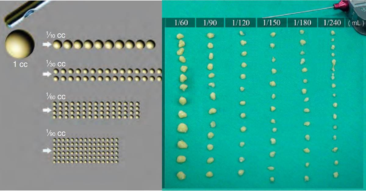 剛剛提到要提高自體脂肪移植的存活率,除了脂肪顆粒要夠小以外,能夠持續且穩定的產生每個脂肪顆粒也是很重要的。自體脂肪移植大師 Coleman 在他的研究中也特別強調:每個脂肪顆粒大小在 1/30 cc~1/50 cc 可以得到最好的脂肪存活率。