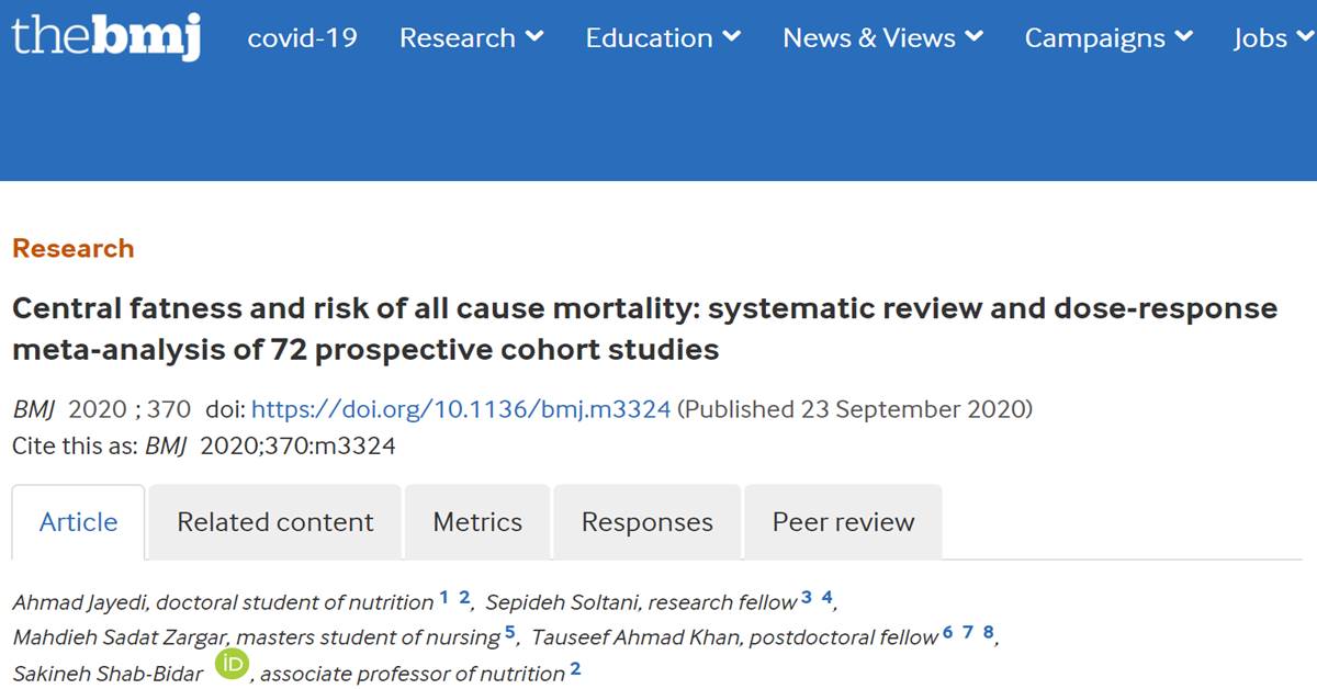 Jayedi A, Soltani S, Zargar MS, Central fatness and risk of all cause mortality: systematic review and dose-response meta-analysis of 72 prospective cohort studies. BMJ. 2020 Sep 23;370:m3324. doi: 10.1136/bmj.m3324.