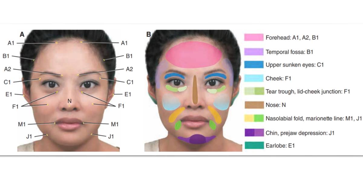 在這過程中,主要就是利用脂肪槍將剛才純化的脂肪打入我們欲填補的部位,上圖是一些常用的入針點。每次施打時,我們會將填補的區域分為深層、中層及淺層三個層次,利用不同的脂肪顆粒大小去做每個層次的填補以達到較完美的效果。