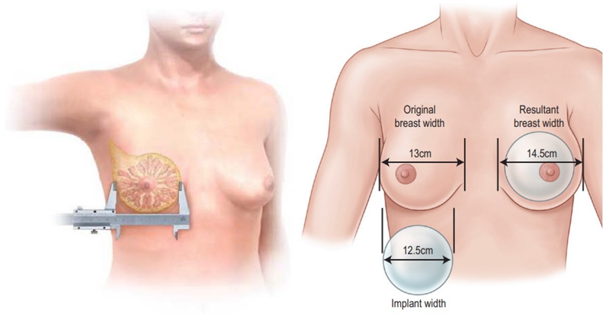 上面這張圖大致說明了醫師如何決定放多大的假體,每個求美者的體形都不一樣,高矮胖瘦的程度也都不相同。一般我們會測量乳房的水平直徑,如果胸廓原本就比較寬的話,就有機會置放較大的假體,如果本身條件就比較纖細的求美者,假體的選擇就會比較受限。