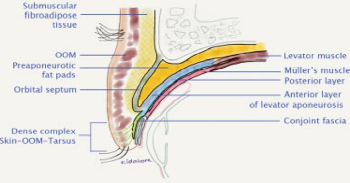 眼皮是全身上下皮膚最薄的地方,在這麼薄的組織結構裡面又分了三個層次:前層包括皮膚及眼輪匝肌(OOM, orbicularis oculi muscle),中層包括隔膜(orbital septum)及前後的脂肪組織,後層則有眼瞼板(tarsal plate)、結膜(conjunctive)以及提眼瞼肌(levator muscle)等肌肉群。